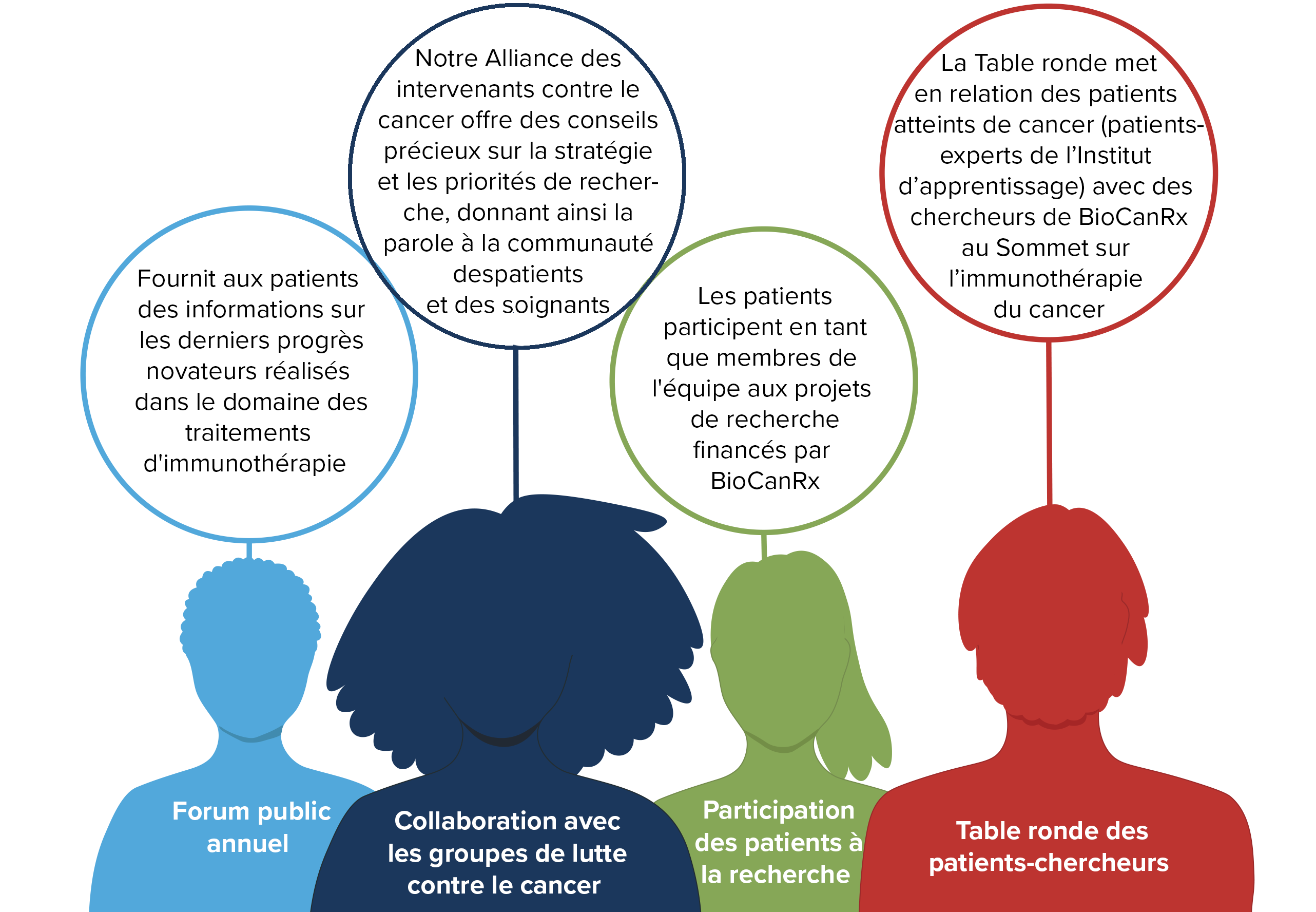 La voix du patient est essentielle pour veiller à ce que BioCanRx travaille pour répondre aux besoins non comblés de la communauté des patients atteints de cancer et faire progresser l’immunothérapie au profit des patients canadiens. Par exemple, l’Alliance des intervenants contre le cancer (AIC) de BioCanRx est un consortium d’organismes de bienfaisance œuvrant dans le domaine de la recherche sur le cancer, la défense des droits des patients et le soutien aux patients et à leur famille. L’AIC fournit des conseils sur la stratégie et les priorités de recherche et sur les questions relatives à l’accès, à l’éthique, aux aspects juridiques, à la réglementation et aux défis sociaux liés à la prestation d’immunothérapies novatrices aux Canadiens. Cela comprend de faire participer les patients en tant que partenaires au sein du processus de recherche de BioCanRx pour qu’ils collaborent de façon significative avec les chercheurs.