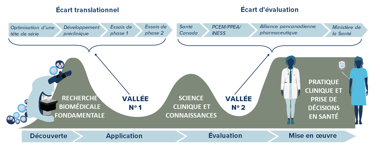 Le parcours pour mettre une nouvelle thérapie sur le marché dépend de deux processus séquentiels : obtenir l’autorisation de mise sur le marché de l’organisme de réglementation (Santé Canada) et le remboursement d’un payeur (un ministère de la santé provincial). La réalisation en séquence de ces deux évaluations liées mais différentes prend du temps. Afin de permettre un accès plus opportun aux médicaments, Santé Canada a élaboré une initiative qui permettrait l’alignement de ces processus avec ceux des organisations d’évaluation des technologies de la santé comme l’Agence canadienne des médicaments et des technologies de la santé (ACMTS) et l’Institut national d’excellence en santé et en services sociaux (INESS – Québec). Ces processus se déroulent à des étapes plus avancées d’un cycle de développement des produits (phase III).