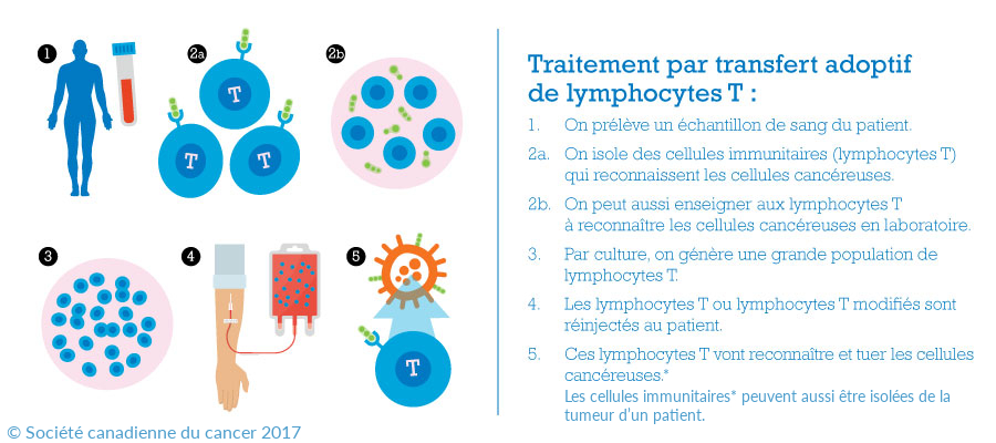 L’immunothérapie consiste à mettre au point ou à prélever des cellules immunitaires anticancéreuses, des cellules T, pour les cultiver en grand nombre en laboratoire et les réinjecter ensuite aux patients. On trouve des cellules immunitaires dans la plupart des tumeurs, mais elles ont généralement été désactivées par le cancer ou sont en nombre insuffisant pour éradiquer à elles seules le cancer. On peut les manipuler génétiquement ou biologiquement pour les rendre plus puissantes et les réactiver. Cette approche a permis d’obtenir des réactions cliniques sans précédent chez des patients aux prises avec un cancer avancé.