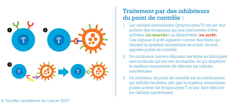 Les inhibiteurs de points de contrôle sont des médicaments qui bloquent l’activation de certaines voies des points de contrôle immunitaires. Ces médicaments permettent au système immunitaire de « relâcher les freins », ce qui permet au système immunitaire de reconnaître les cellules cancéreuses et de s’y attaquer. ©Patient Resource