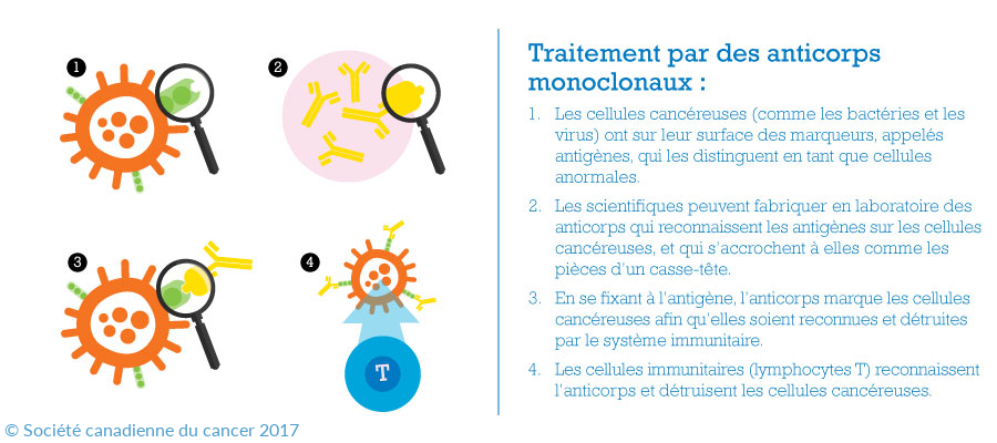 Les anticorps sont de grandes protéines en forme de « Y » produits par le système immunitaire quand celui-ci détecte des substances nocives appelées antigènes. Ces derniers se trouvent dans des microorganismes (bactéries, champignons, parasites et virus), des produits chimiques et des cancers. Les anticorps peuvent être purifiés, rehaussés ou conçus pour traiter le cancer de différentes façons. Les traitements par anticorps peuvent: