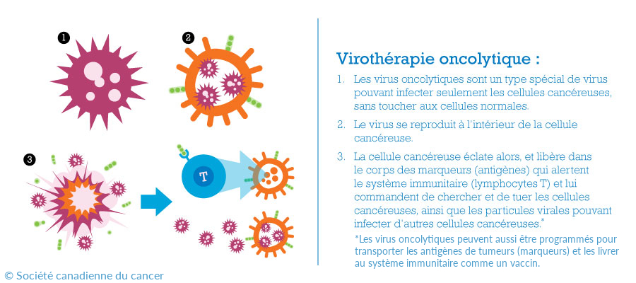 Les virus oncolytiques tirent parti du fait que de nombreuses cellules cancéreuses d’une tumeur ne disposent pas des défenses qu’ont les cellules saines pour combattre une infection virale. Par conséquent, les virus spécialement conçus peuvent trouver les cellules cancéreuses dans le corps, les infecter et se reproduire à l’intérieur d’elles jusqu’à ce qu’elles se désintègrent (lysent) et meurent. Le virus n’endommage pas les cellules saines. Cela permet également de signaler l’existence de la tumeur au système immunitaire, qui est ainsi activé pour combattre le cancer. De plus, le système immunitaire est entraîné à reconnaître le cancer comme étant une menace et peut prévenir sa propagation à d’autres endroits.
